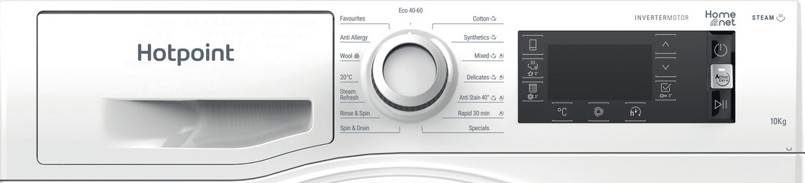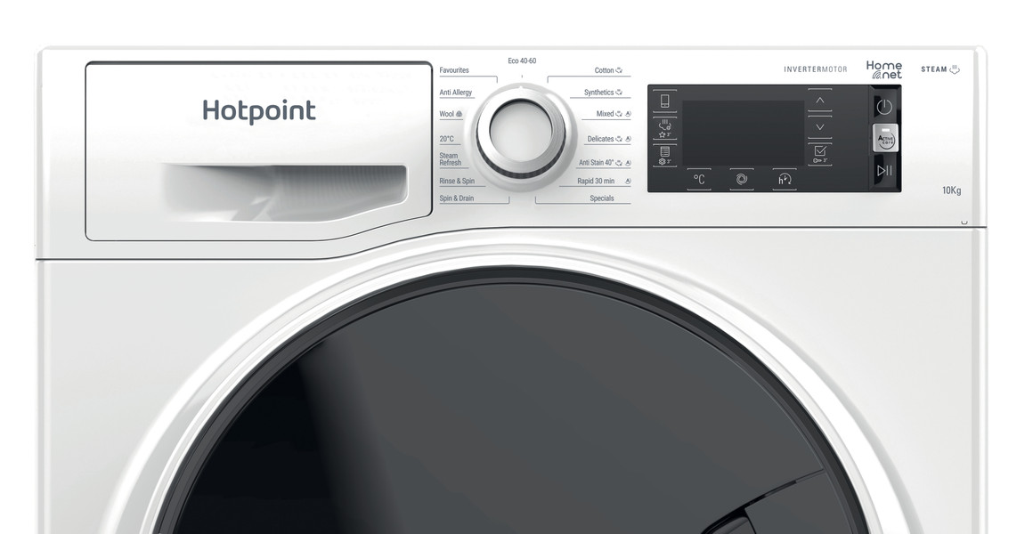 We care for the things you love. This Hotpoint ActiveCare NLLCD 1046 WD AW UK N 10kg freestanding white Washing Machine ensures your family’s clothes always look their best. Best-in-class for stain removal, our ActiveCare technology takes care of your clothes by removing stains at temperatures as low as 20°C, so you can wear your favourite clothes time and time again. Protect your loved ones with the Steam Hygiene cycle, which provides the ultimate protection for a totally hygienic wash. Steam hygiene injects steam directly into the drum at the end of the cycle, removing up to 99.9%* of the most common bacteria without the use of chemical additives. Thanks to the special Rapid/Eco function, you can customise the washing cycle according to your needs, giving you the option to choose either to speed up the cycle or save on energy. Dropped an item on the way to the washing machine? No problem with Stop&Add – simply add laundry to your wash during the first few minutes of the cycle, without compromising on performance. *Tested by Allergy UK